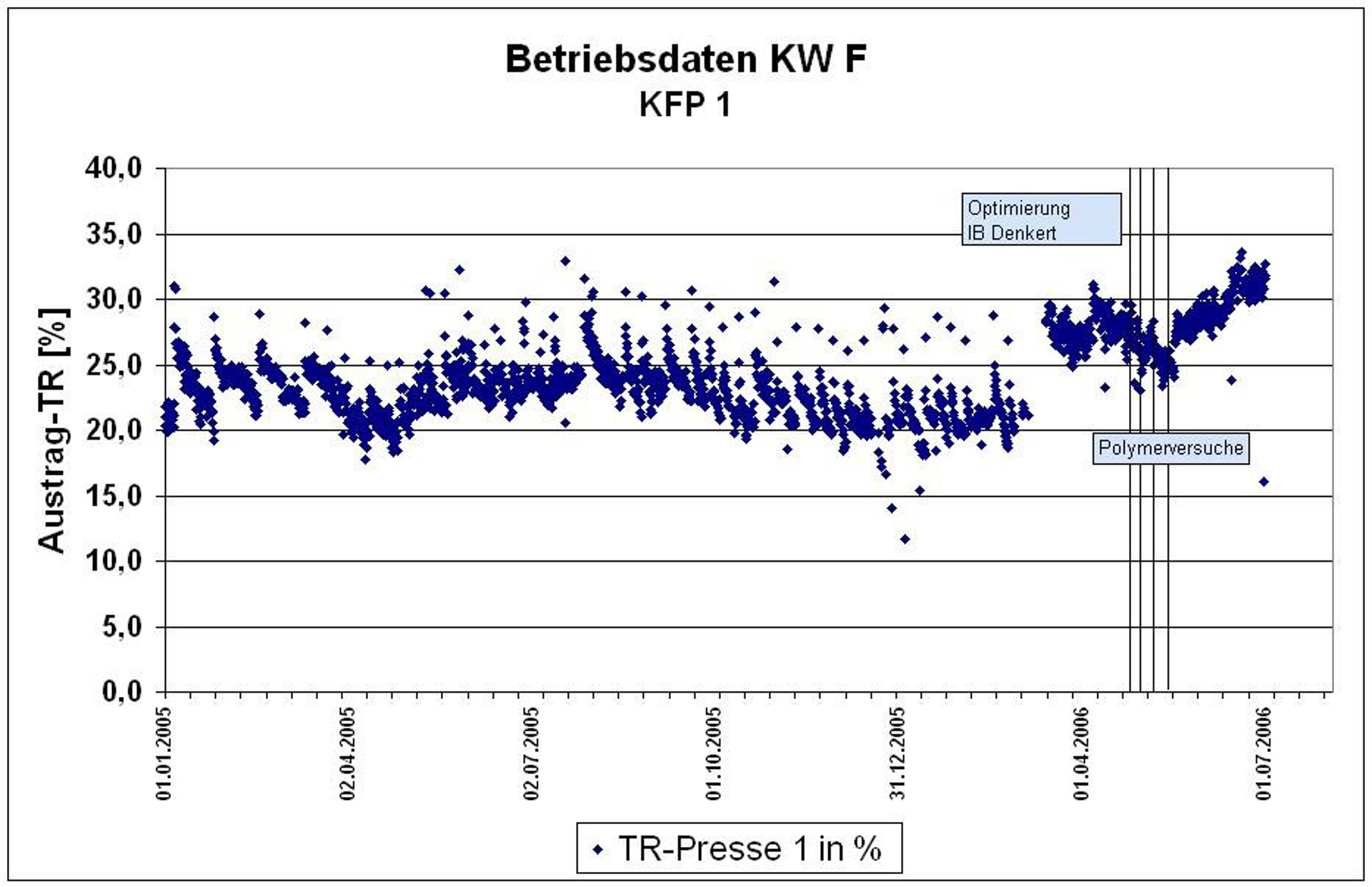 Nachfolgend sind zwei Beispiele für Kammerfilterpressen mit Polymer-Konditionierung in einem Großklärwerk in Baden-Würtemberg (ca. 600.000 EW) und in einer weiteren Kläranlage (ca. 250.000 EW) dargestellt. Hier haben wir nach Erfassung der Schlammkennwerte und der gesamten Verfahrenstechnik Entwässerungsanlage eine Optimierung der Anlagentechnik und der Betriebsweise der Entwässerungsmaschine durchgeführt. Der Austrags-Feststoffgehalt wurde nach intensiver Betreuung gemäß nachfolgender Grafik deutlich erhöht, bei gleichzeitiger Verminderung des spez. Flockungsmittel-Verbrauchs und Erhöhung der Zulauf-Fracht. Es kam jeweils zu einer signifikanten Verminderung der Betriebskosten für die Klärschlamm-Entwässerung und –Entsorgung. Im Zweiten Beispiel wird die Kammerfilterpresse durch Zentrifugen ersetzt.