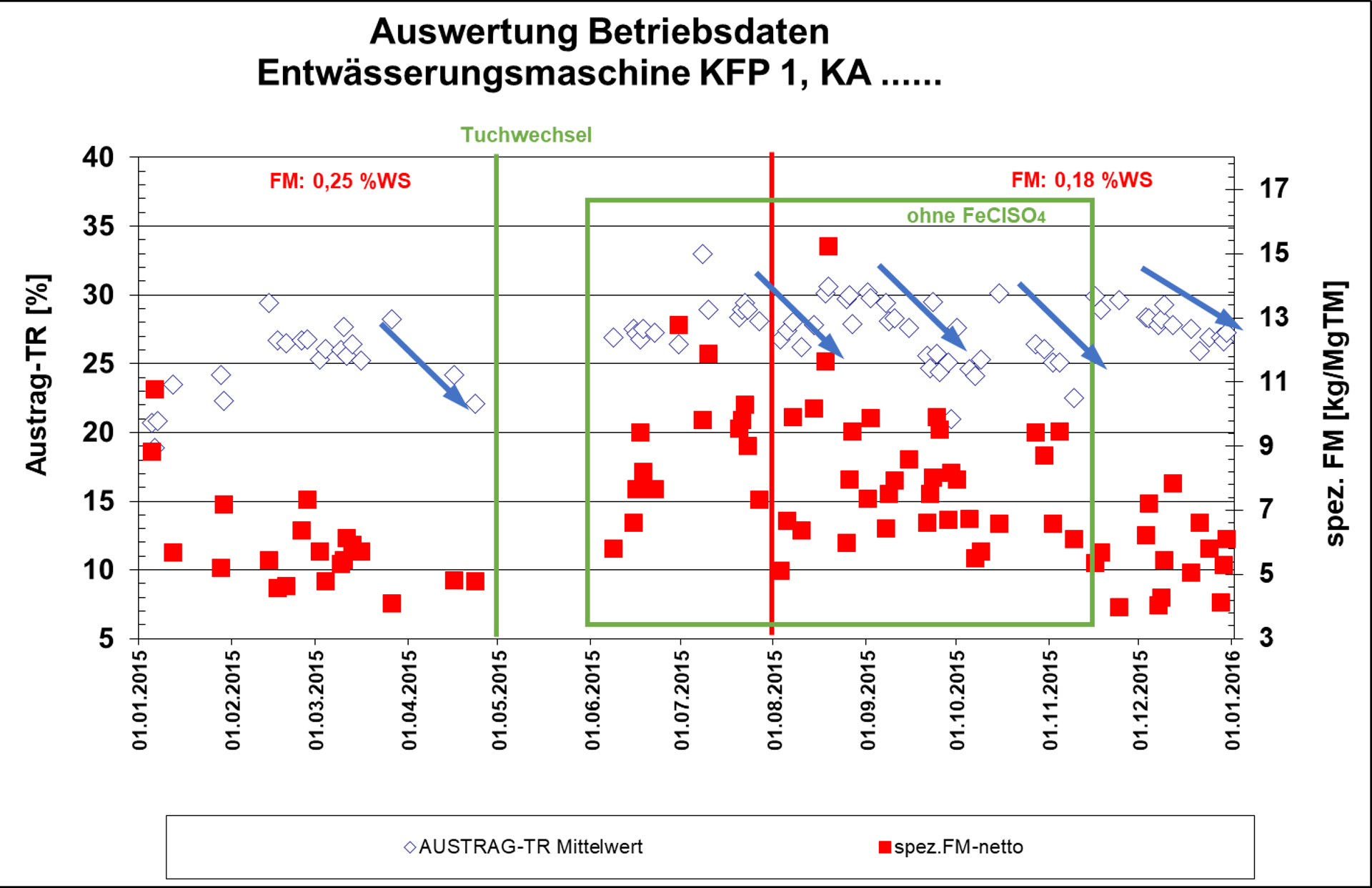 Nachfolgend ist ein Beispiel für die Optimierung einer Entwässerungs-Zentrifuge auf einem Großklärwerk (ca. 100.000 EW) dargestellt. Hier haben wir nach Erfassung der Schlammkennwerte und der gesamten Verfahrenstechnik Entwässerungsanlage eine Optimierung der Anlagentechnik und der Betriebsweise der Entwässerungsmaschine durchgeführt. Der Austrags-Feststoffgehalt wurde nach intensiver Betreuung gemäß nachfolgender Grafik deutlich erhöht, bei gleichzeitiger Verminderung des spez. FM-Verbrauchs und Erhöhung der Zulauf-Fracht.