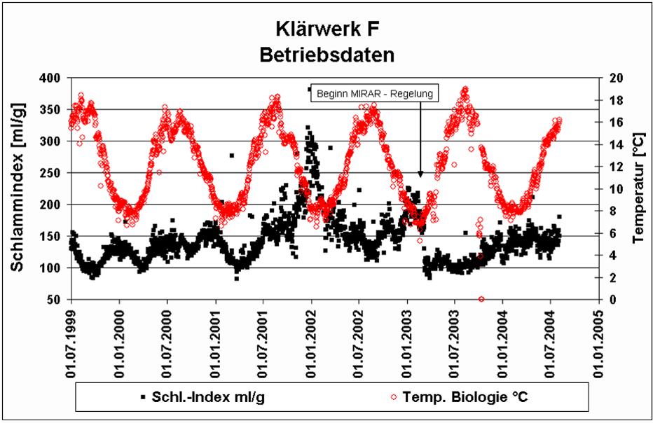 Sehr positive Erfahrungen liegen mit der hier mitentwickelten MIRAR Mischrampen-Regelung auf PC-Basis vor. Hierbei werden die Eingangswerte über einstellbare Rampenfunktionen in abgestufte Wirkungswerte umgerechnet. Neben den weiteren online-Messgrößen wird die wartungsarme und kostengünstige online REDOX-Potenzialmessung ausgewertet. Aufgrund der Mischrampenregelung ist es nicht notwendig, die Regelung von dem Erkennen des unteren Umkehrpunktes des REDOX-Messwertes abhängig zu machen. Nachfolgende Projekte mit Installation der Mischrampen-Regelung (MIRAR) sind erfolgreich realisiert worden:
