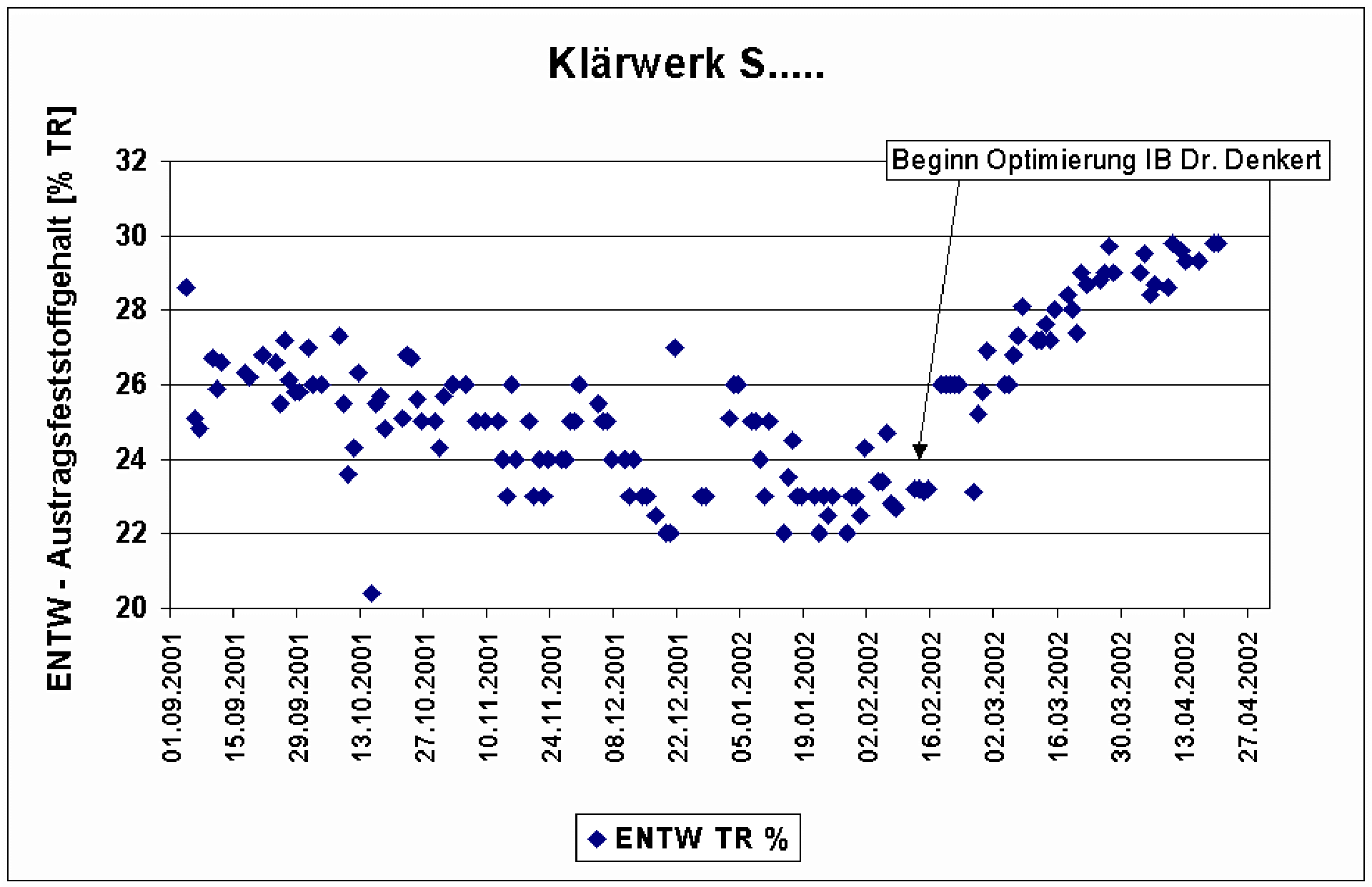 Nachfolgend ist ein Beispiel für die Optimierung einer Entwässerungs-Zentrifuge auf einem Großklärwerk (ca. 100.000 EW) dargestellt. Hier haben wir nach Erfassung der Schlammkennwerte und der gesamten Verfahrenstechnik Entwässerungsanlage eine Optimierung der Anlagentechnik und der Betriebsweise der Entwässerungsmaschine durchgeführt. Der Austrags-Feststoffgehalt wurde nach intensiver Betreuung gemäß nachfolgender Grafik deutlich erhöht, bei gleichzeitiger Verminderung des spez. FM-Verbrauchs und Erhöhung der Zulauf-Fracht.