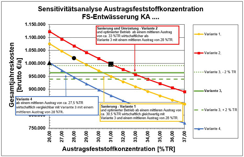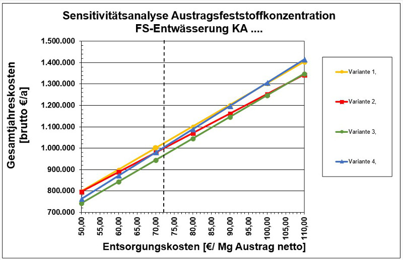 - Variantenvergleich der verschiedenen schlammspezifisch zu bewertenden Maschinenssysteme mit Kostenschätzung einer kompletten Anlage mit Maschinen-, Verfahrens- und EMSR-Technik auf Basis aktueller Submissionsergebnisse und ggf. einer Richtpreisanfrage.