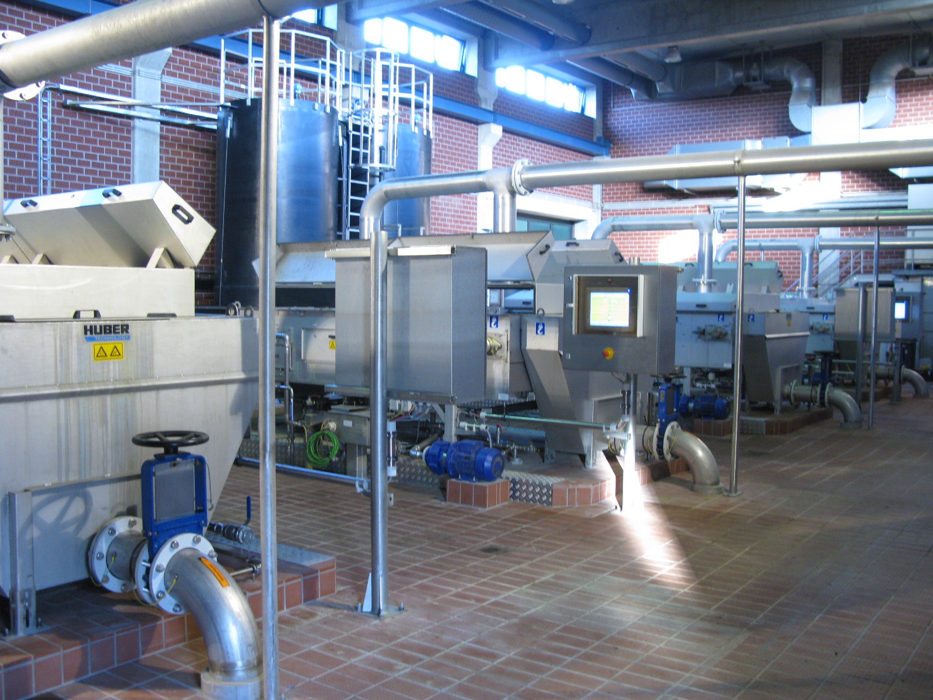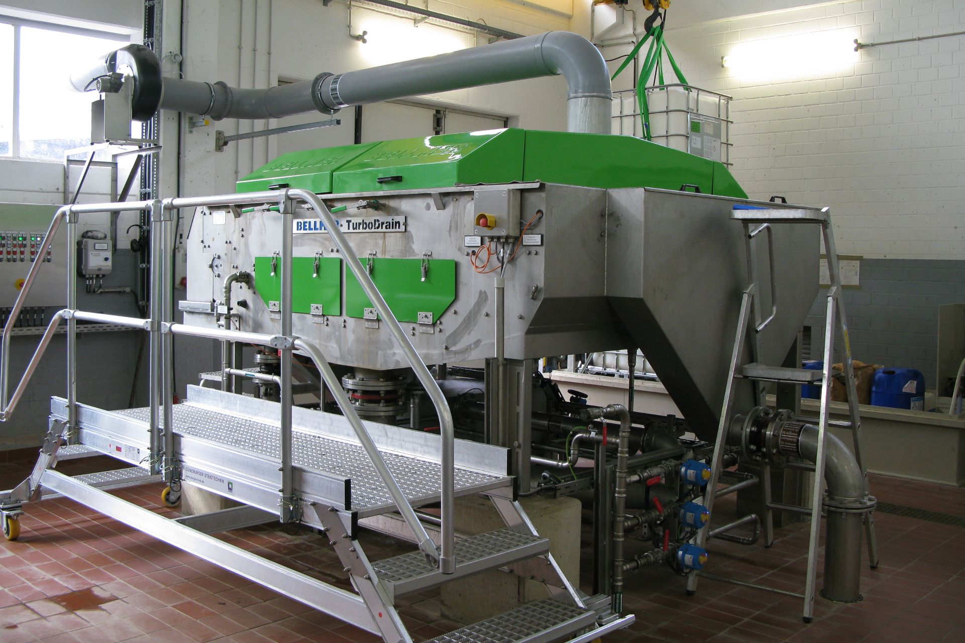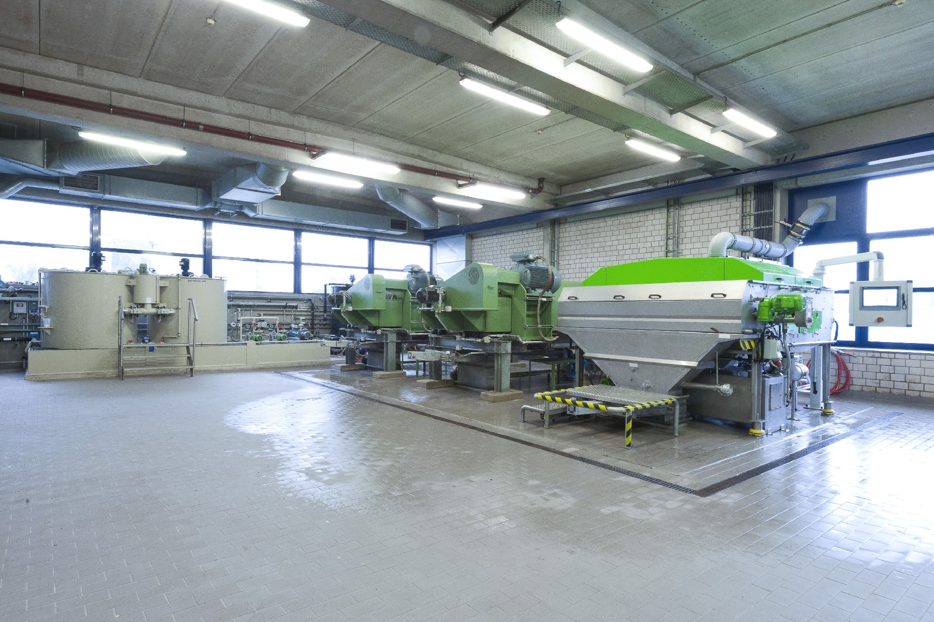 - Installation eines frachtgeregelten Bandeindickers (Baugröße nutzbare Siebbandbreite ca. 2 m) mit automatischer Siebbandreinigung, Schmutzwasserrückführung, Abdeckung und Abluftabsaugung,